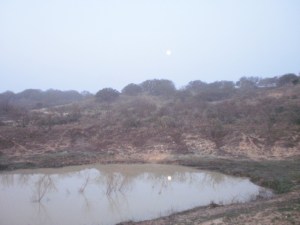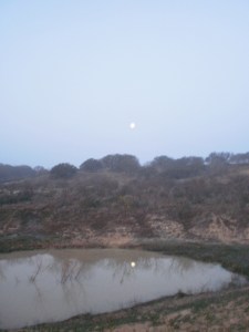 Okay, I’m always writing about how lucky I am to see such beautiful sunrises here at the Mountain Pasture in Central Texas, but this morning I saw a totally different incredible sight. As I looked out the bedroom window just before I left for work, I noticed that there was no impending sunrise, but there was fog hanging low. I thought, “Darn, there won’t be any cool sunrises to see this morning.” I got in the car and started down the mountain, and just as I passed the first little tank of water, I realized what I had just seen, so I hit the brake and began backing the car. Sure enough, there was this beautiful reflection of the nearly-full moon in the small earthen tank of water. I put my car window down and grabbed my tiny, little camera and snapped three shots before heading on in to school. Usually the moon blurs with my little camera, but I thought these photos turned our fairly well. Of course, you can also see how Central Texas looks in the dead of winter……..brown and gray! The winter grasses have turned green since the recent rains, and a few weeds are peeking out green, so before we know it, the heart of Texas will put on her Easter bonnet of every color in the rainbow, but for now, here’s the amazing moon of this morning.