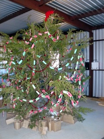 The second photo is of the last cedar tree we had when we still lived in the cabin, but had our Christmas in the barn. Of course that was before the barn was full of “stuff”. I must admit that making paper chains, hanging candy canes and bells, and wrapping our presents in brown mailing paper with twine tied around them was a blast! The oil candles were fun, too. It was a little chilly in the barn since we didn’t have much in the way of heat or light. We did have some Coleman lanterns hanging from the ceiling.